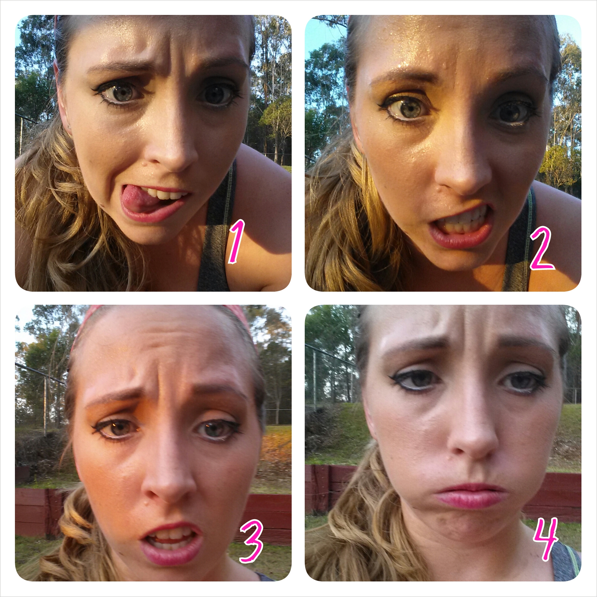 As a special treat, to give you an idea of just how hard Kayla’s workouts can be, on my last workout of week 8 I took a selfie after each circuit! Yes, I know I worked out with make up on, no, I didn’t put it on to workout. This workout was done as soon as I got home from work that day.
