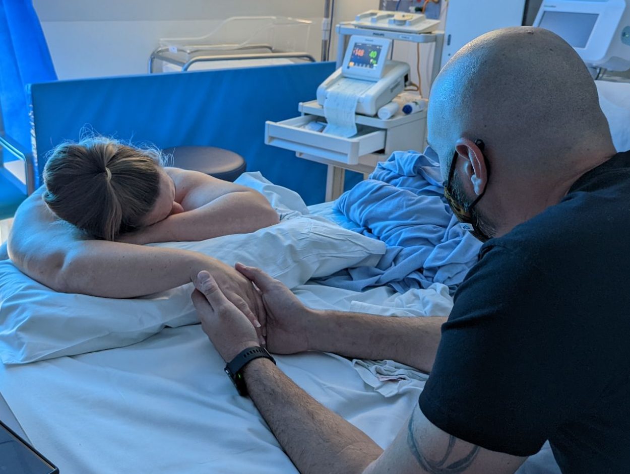 I moved into the shower and kneeled down. Tony had the water on as hot as it would go and was spraying it on my back which helped with the pain of the contractions. We stayed in there for ages. After a couple hours, Tony told the midwife that I was ready to get checked again. As I waited for the doctor to come back and check me, I was sitting on the pregnancy ball and leaning over the bed. I was unconscious in between contractions, waking up to moan through them, and then unconscious again when each one finished. My heart rate was so high during the contractions that the CTG was struggling to differentiate between my heart rate and the baby’s heart rate. I really wasn’t coping.
