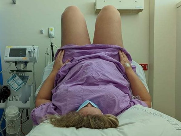I was wheeled into pre-op. My memory here is pretty foggy because I was so tired. I sat in the pre-op room for a little while before I was wheeled into the operating theatre and the anaesthesiologist prepared to give me a spinal. I was sitting on the edge of the bed hunched all the way over, and the biggest guy in the room put his elbows on my shoulders and put all of his weight onto me so that I couldn’t move. Just as they were about to put in the needle, I started to have a contraction and yelled, ” I’m having a contraction!” Everyone stood still and waited for it to pass. Once it was done they put in the spinal and I laid down. Some time passed while I assume they prepared the room and me for my c-section and waited for the spinal to take effect. I just remember chatting with Tony and being excited that we were going to meet our baby.
